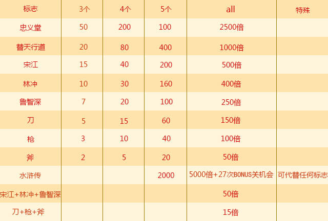 当连线中水浒传标志≥3时,即可进入bonus关卡进行挑战。3个水浒传标志可玩1次,4个可玩2次,5个可玩3次,15个可玩27次。